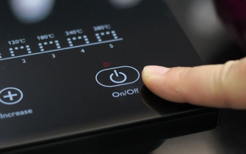 Để bắt đầu nấu, đặt nồi hoặc chảo lên bếp và bật nguồn điện bằng cách gạt công tắc. Tiếp theo, nhấn nút on/off để khởi động bếp.